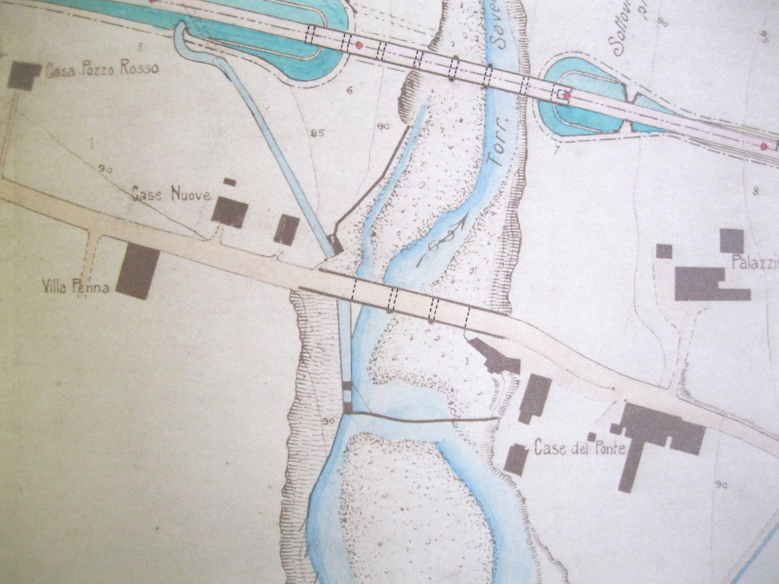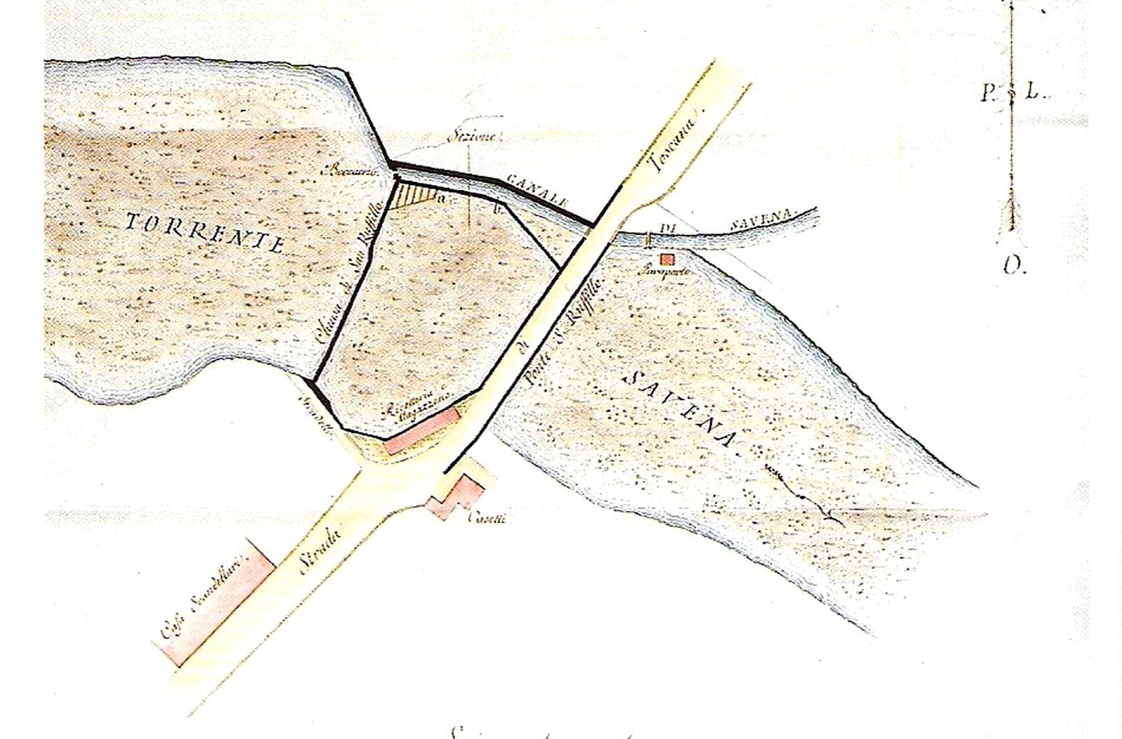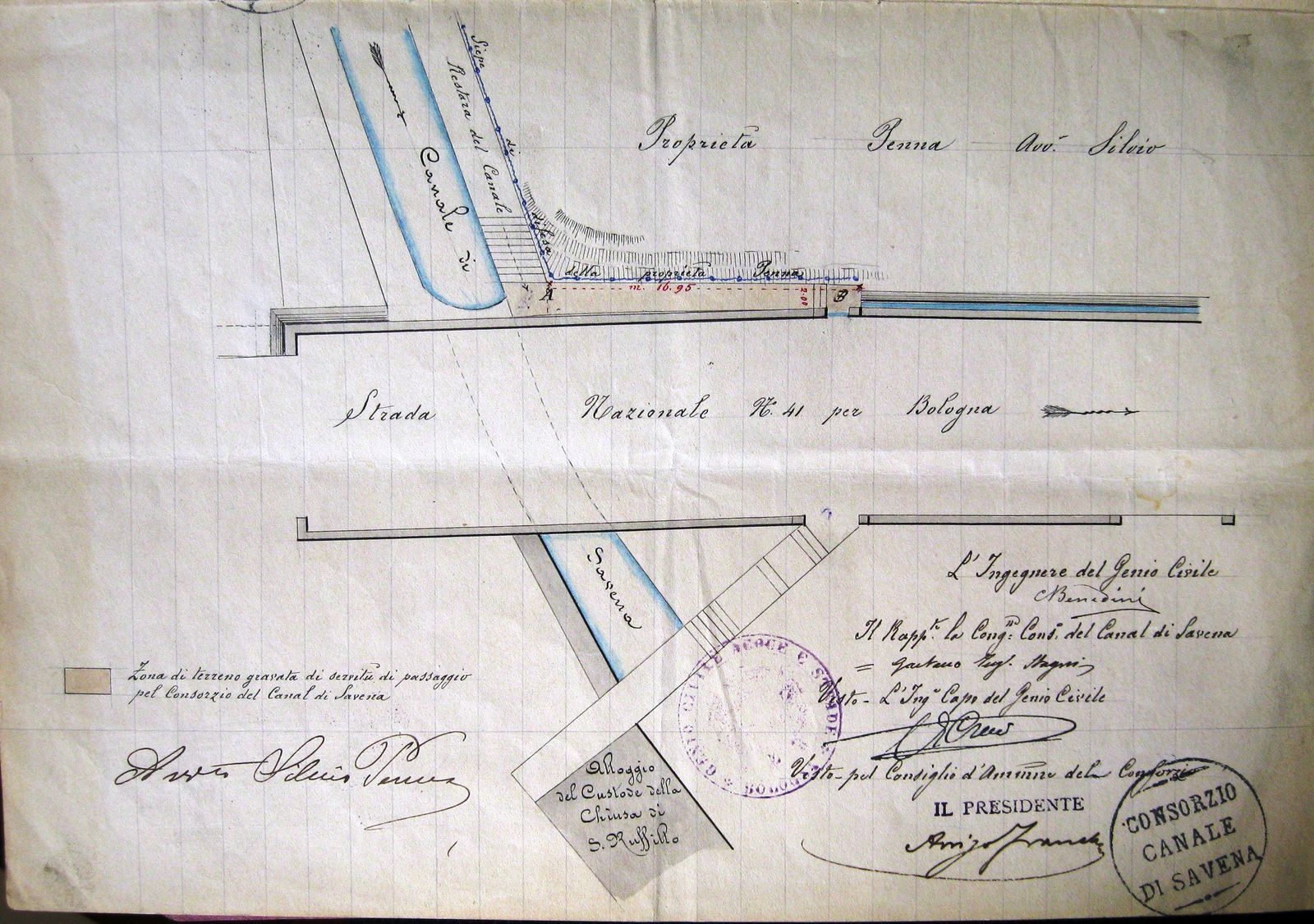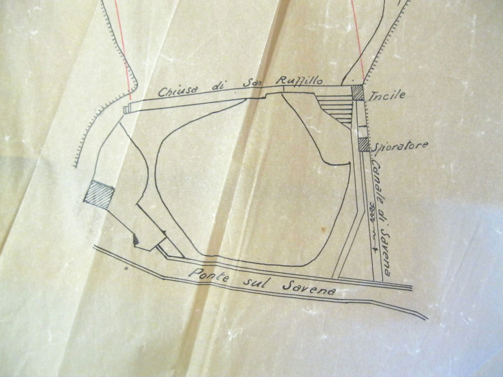 Quando fu demolito l’antico ponte sul Savena e costruito il nuovo, nei primi anni del XX secolo, mutarono le condizioni dei terreni vicini che servivano per l’accesso alla chiusa e al canale: il 7 ottobre 1903 fu steso dal Corpo Reale del Genio Civile, Provincia di Bologna, Ufficio di Bologna, un “Processo verbale di accertamento delle variate servitù di accesso dalla strada Nazionale suddetta [n. 41] agli edifizi della Ill.ma Congregazione Consorziale della Chiusa di San Ruffillo del Canale di Savena presso al ponte di S. Ruffillo”, a cui fu allegato un disegno esplicativo (fig. 6), dal quale si ricava la posizione dell’alloggio del custode della chiusa a valle della strada.