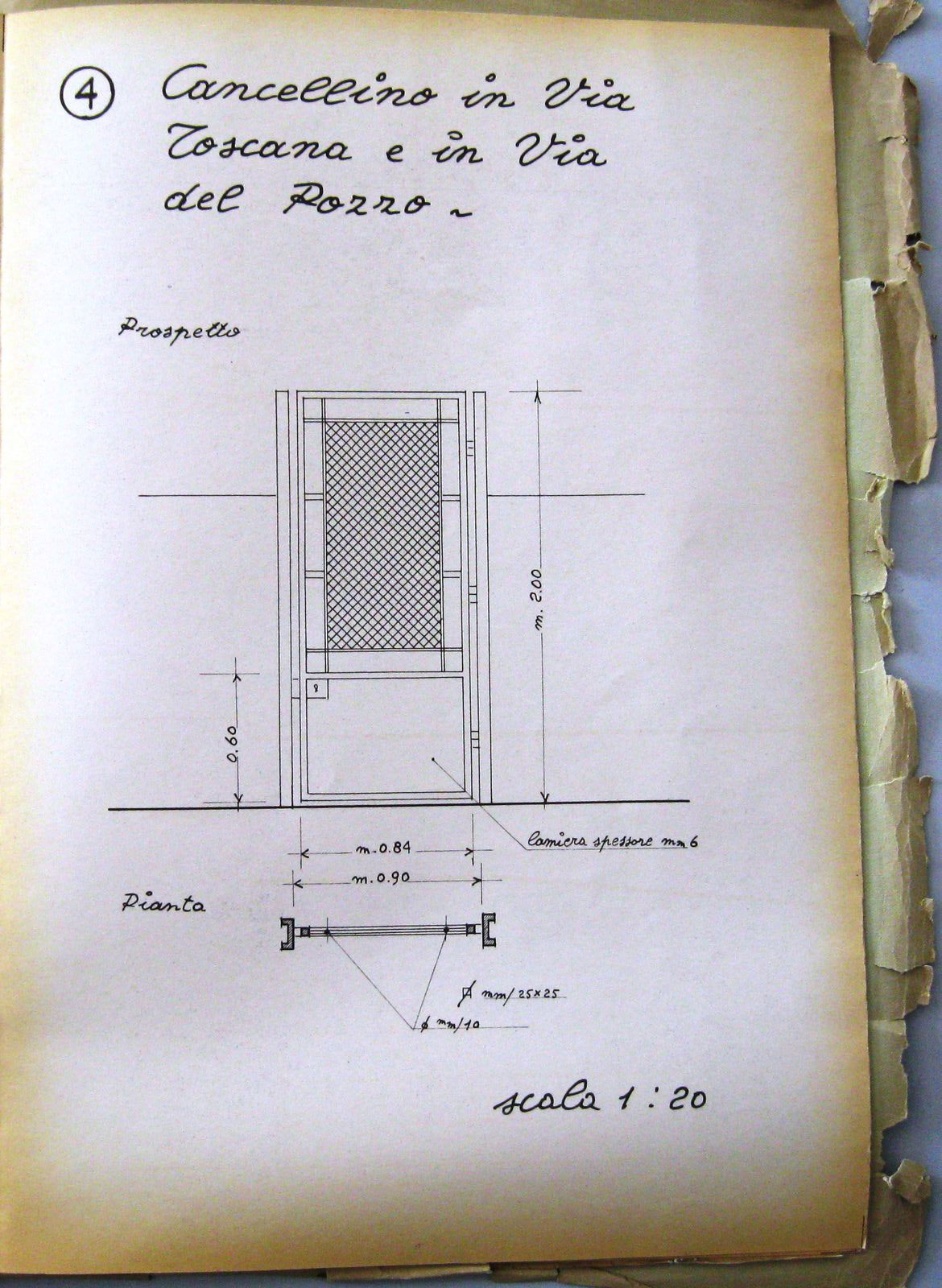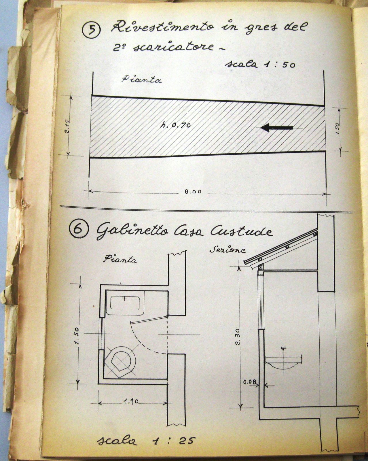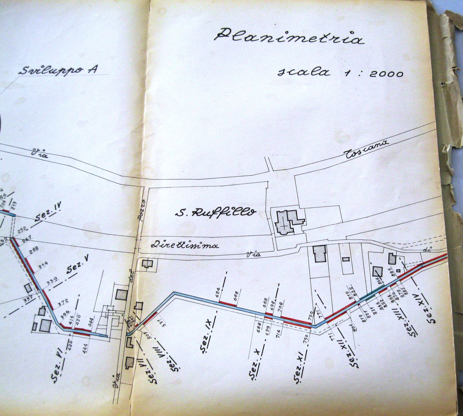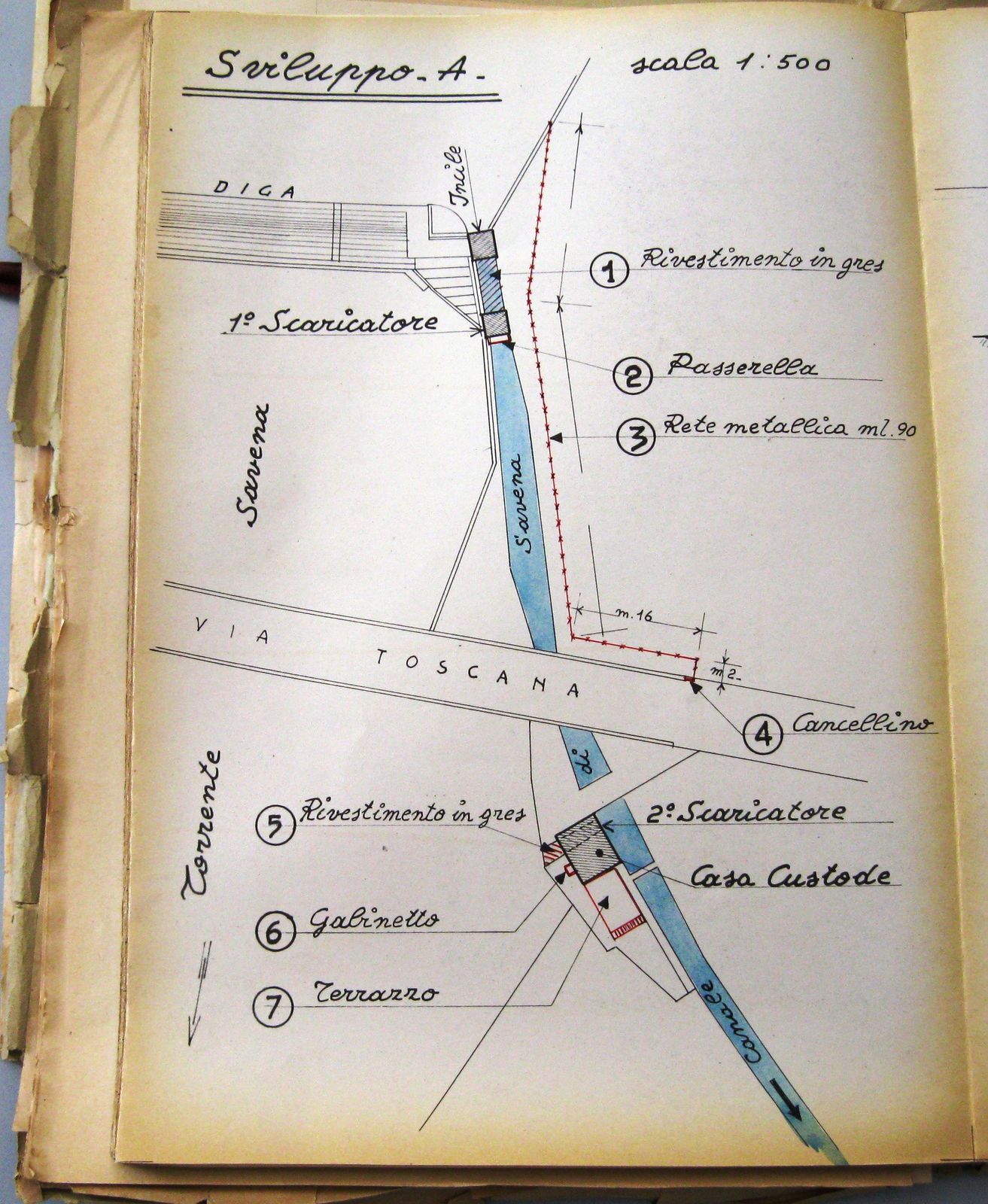 Quando fu demolito l’antico ponte sul Savena e costruito il nuovo, nei primi anni del XX secolo, mutarono le condizioni dei terreni vicini che servivano per l’accesso alla chiusa e al canale: il 7 ottobre 1903 fu steso dal Corpo Reale del Genio Civile, Provincia di Bologna, Ufficio di Bologna, un “Processo verbale di accertamento delle variate servitù di accesso dalla strada Nazionale suddetta [n. 41] agli edifizi della Ill.ma Congregazione Consorziale della Chiusa di San Ruffillo del Canale di Savena presso al ponte di S. Ruffillo”, a cui fu allegato un disegno esplicativo (fig. 6), dal quale si ricava la posizione dell’alloggio del custode della chiusa a valle della strada.