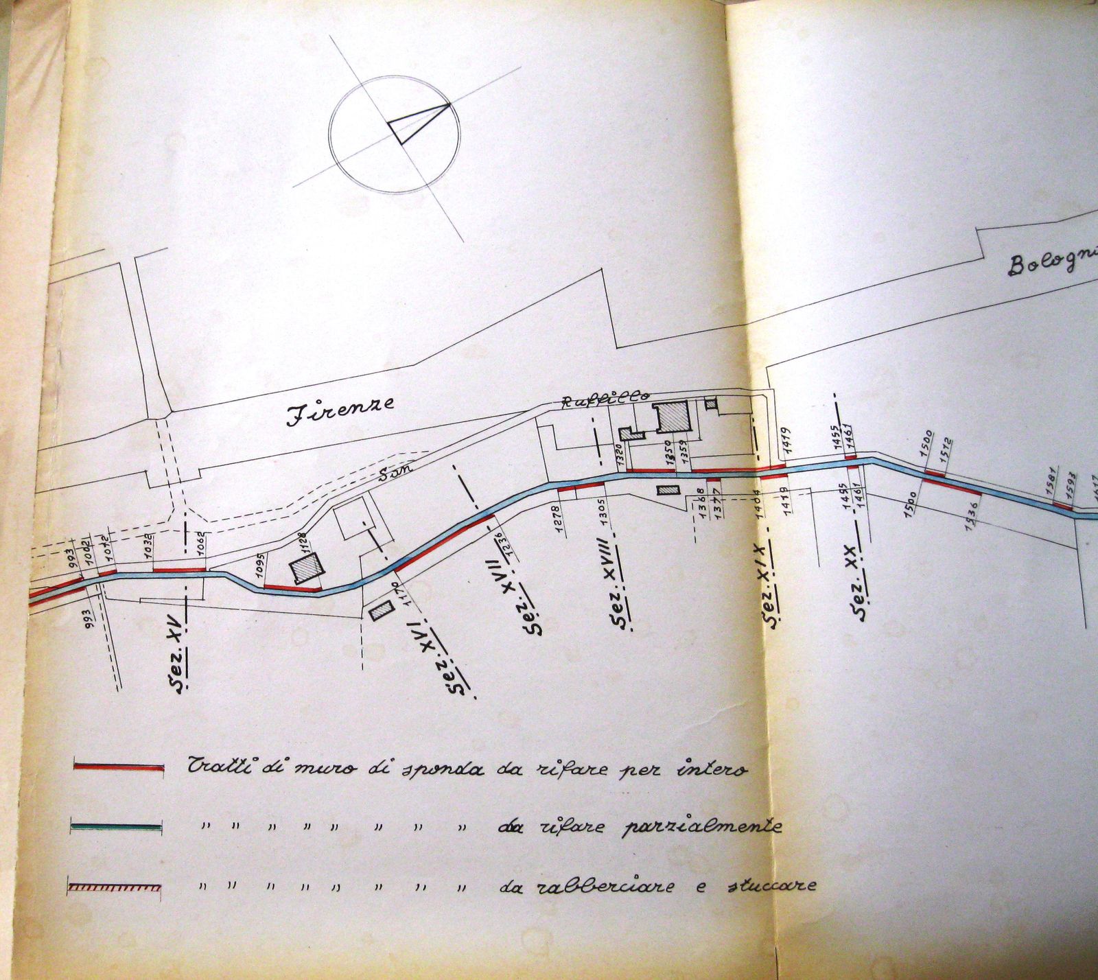 Il 14 ottobre 1948 il Comune, Direzione Servizi Tecnici, Divisione IV, Reparto Fognature, preparava e il 20 seguente inviava al Genio Civile il progetto, consistente nello stato di fatto all’inizio dei lavori e nel vero e proprio progetto di ricostruzione. Lo stato di fatto, intitolato “Consistenza all’inizio dei lavori”, insieme ad una fotografia allegata, mostra con estrema precisione i ruderi della diga minata e bombardata e allora ulteriormente degradata a causa dello scorrere dell’acqua per i tre anni seguenti alla fine della guerra. Ulteriori appunti di lavoro stesi con matite di diversi colori precisano anche dove correva l’acqua del torrente rispetto alla diga semidistrutta.