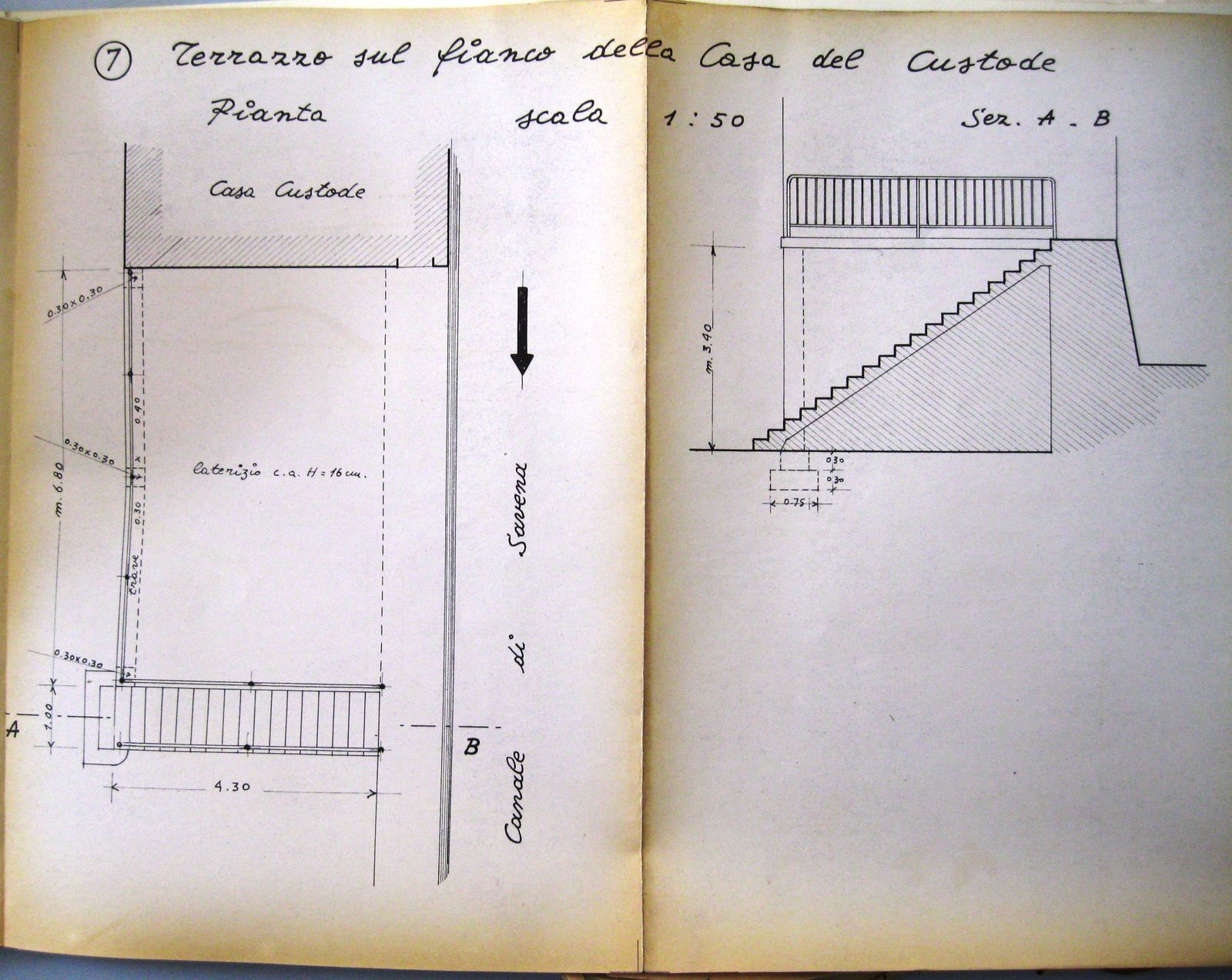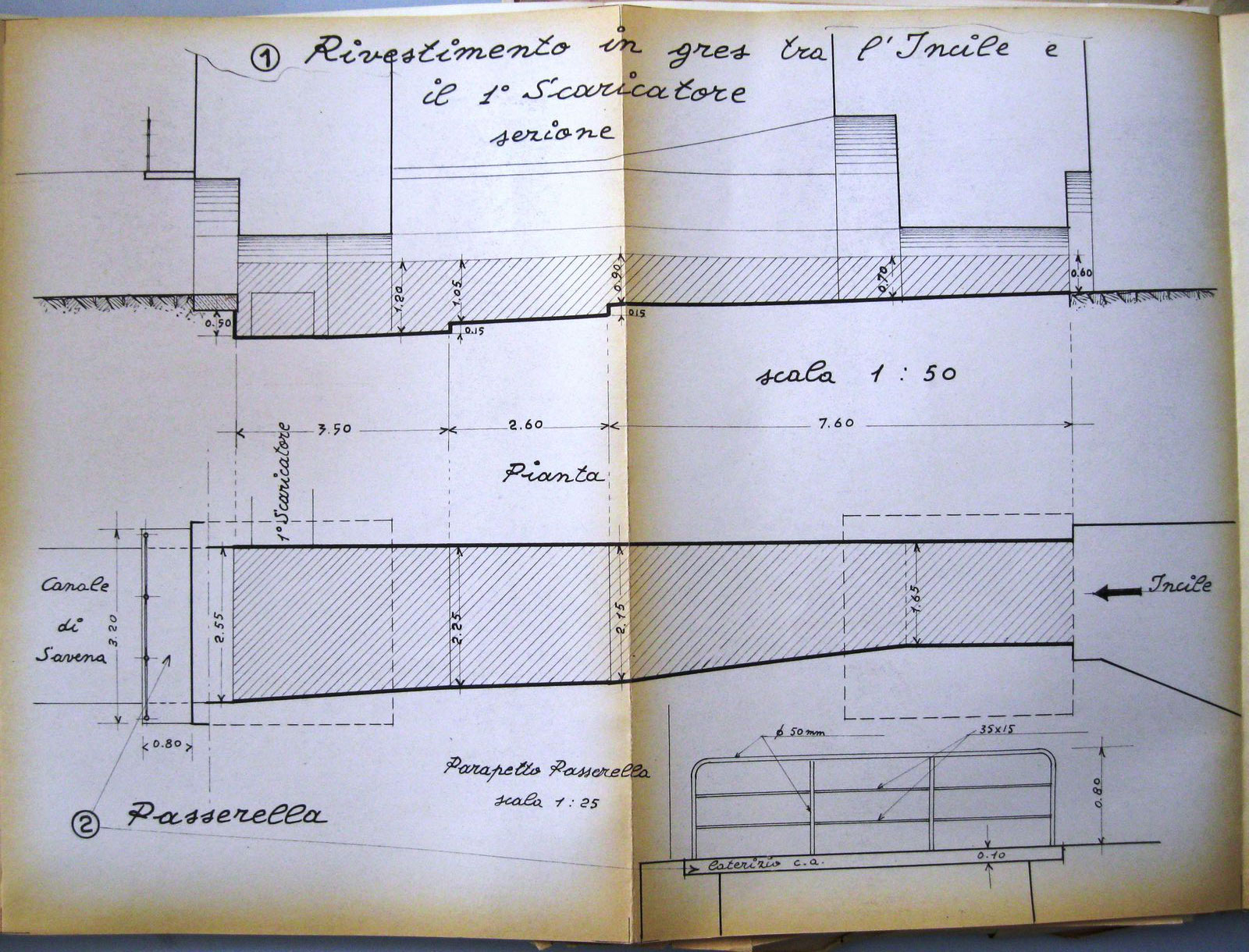 Ancora fra il materiale del Genio Civile si trova il progetto “di ponte viadotto sul Savena per la direttissima Bologna-Firenze” datato “1913, 1914”: il progetto era stato redatto dalle Ferrovie dello Stato e presentato l’8 giugno 1913 al Genio Civile per l’approvazione, ma a seguito di colloqui per adeguare il progetto alle norme, per cui l’approvazione non tardò. Nel disegno di progetto la chiusa sembra avere ancora l’aspetto di un semplice muro, ma un tratto molto sottile obliquo indica i gradini e del resto la planimetria presenta le due costruzioni di controllo del canale (fig. 8).
