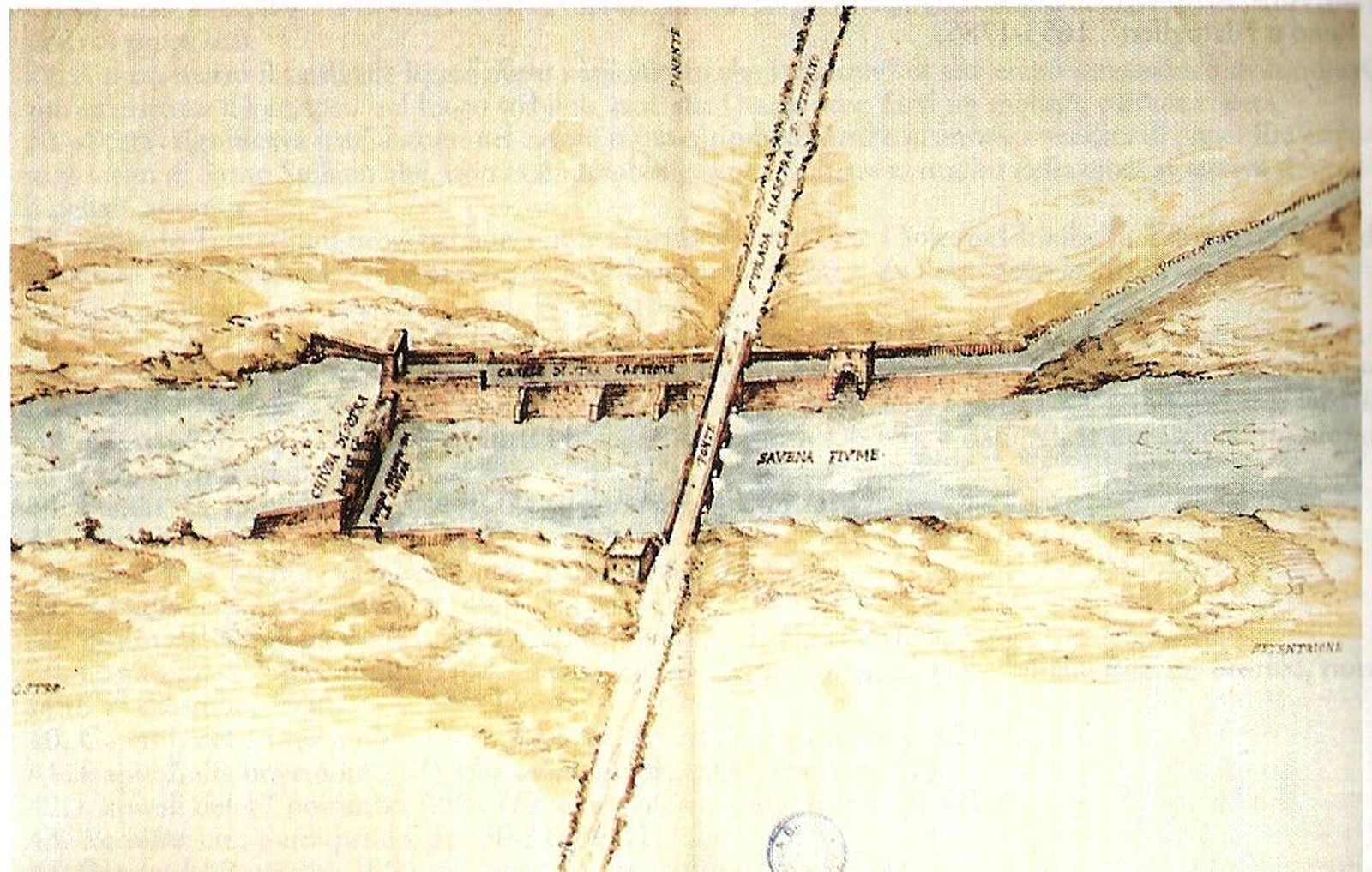 Un estratto di mappa del Catasto Gregoriano, datato al 1845, conservato nel materiale grafico del Genio Civile in Archivio di Stato, mostra con precisione in planimetria la consistenza della chiusa, a quella data ancora costituita da un semplice muro, privo di manufatti particolari, dal cui lato sinistro si staccava il canale, anch’esso sostenuto da un semplice muro. Il ponte della Strada Nazionale era ancora quello medievale (con elementi romani nelle pile), con una strozzatura della strada dalla parte di Bologna (fig. 5). La stessa situazione ma con dettagli più precisi relativi ai gradini dalla parte del canale mostra una pianta della stessa epoca, conservata in una raccolta privata (fig. 5bis).