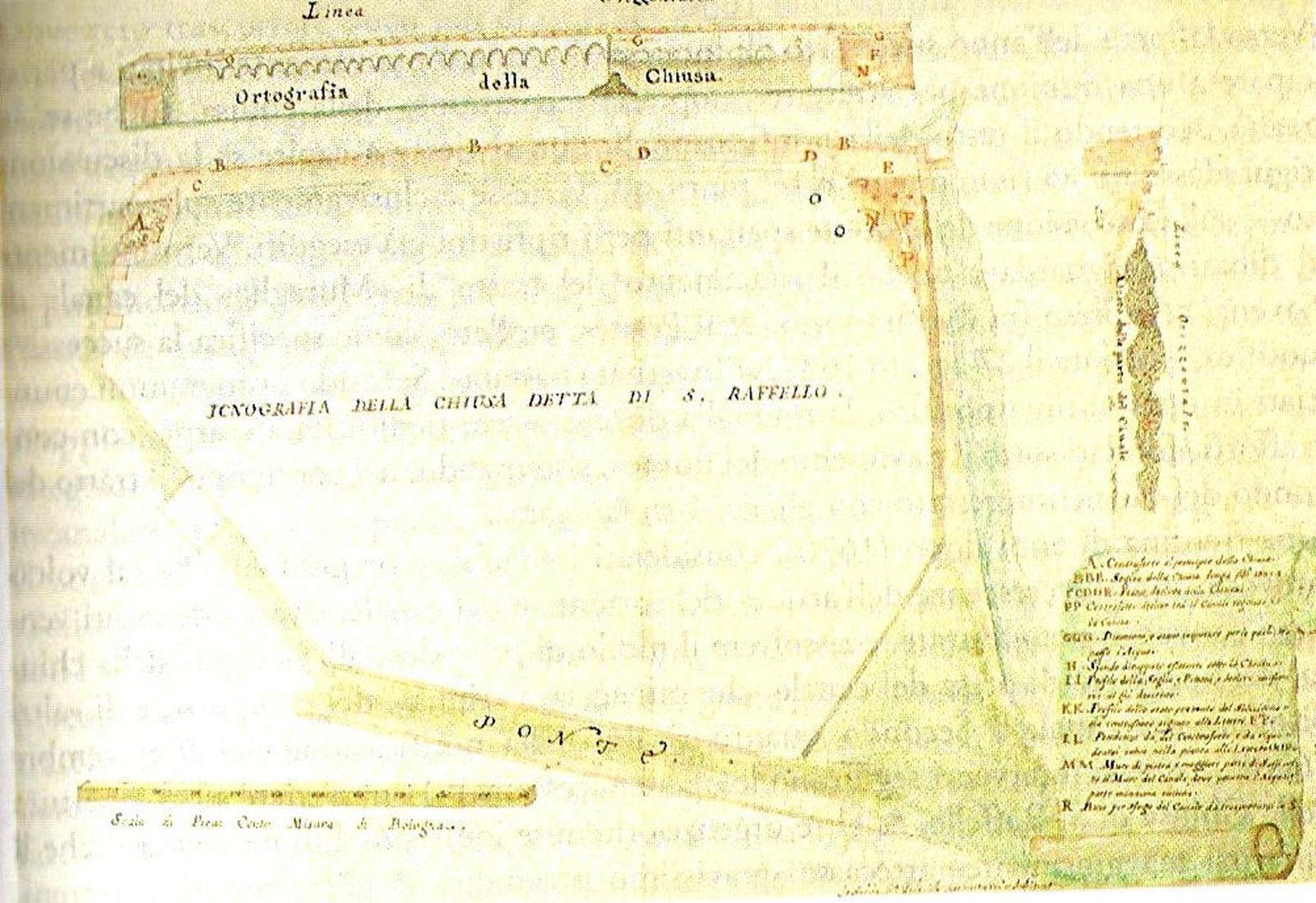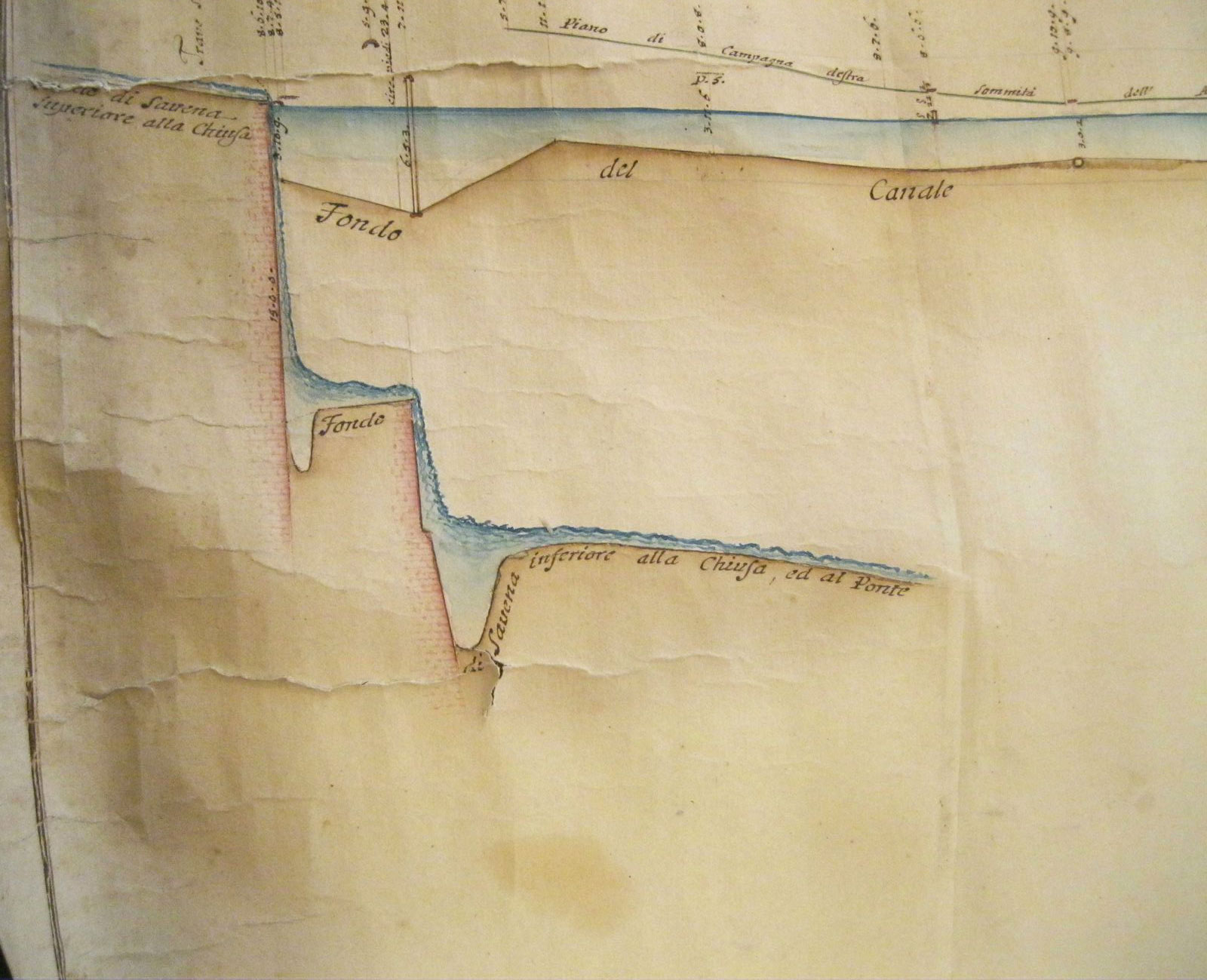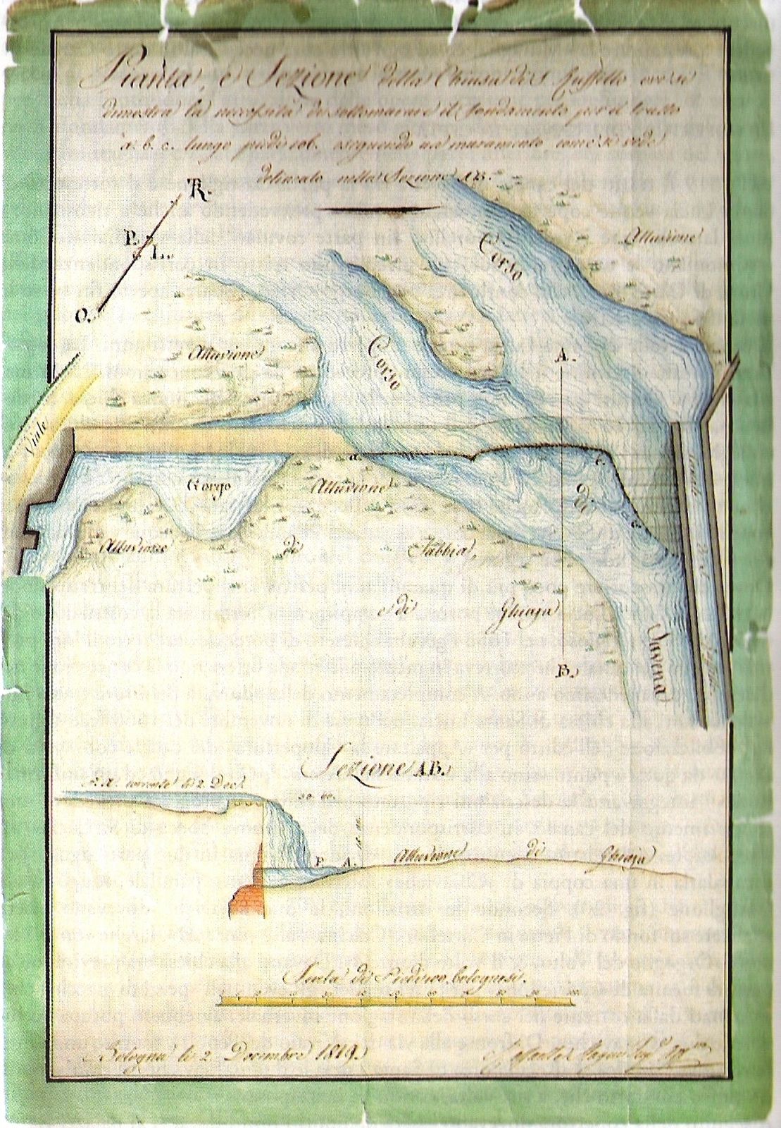 Sembra databile alla fine del Settecento o inizio dell’Ottocento una mappa molto rovinata e in attesa di restauro conservata nell’archivio del Consorzio della Chiusa del Canale di Savena, mostra in sezione il salto creato nel torrente Savena dalla chiusa, costituita allora da un semplice muro di mattoni (fig. 3).