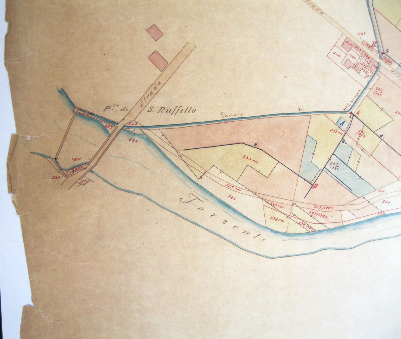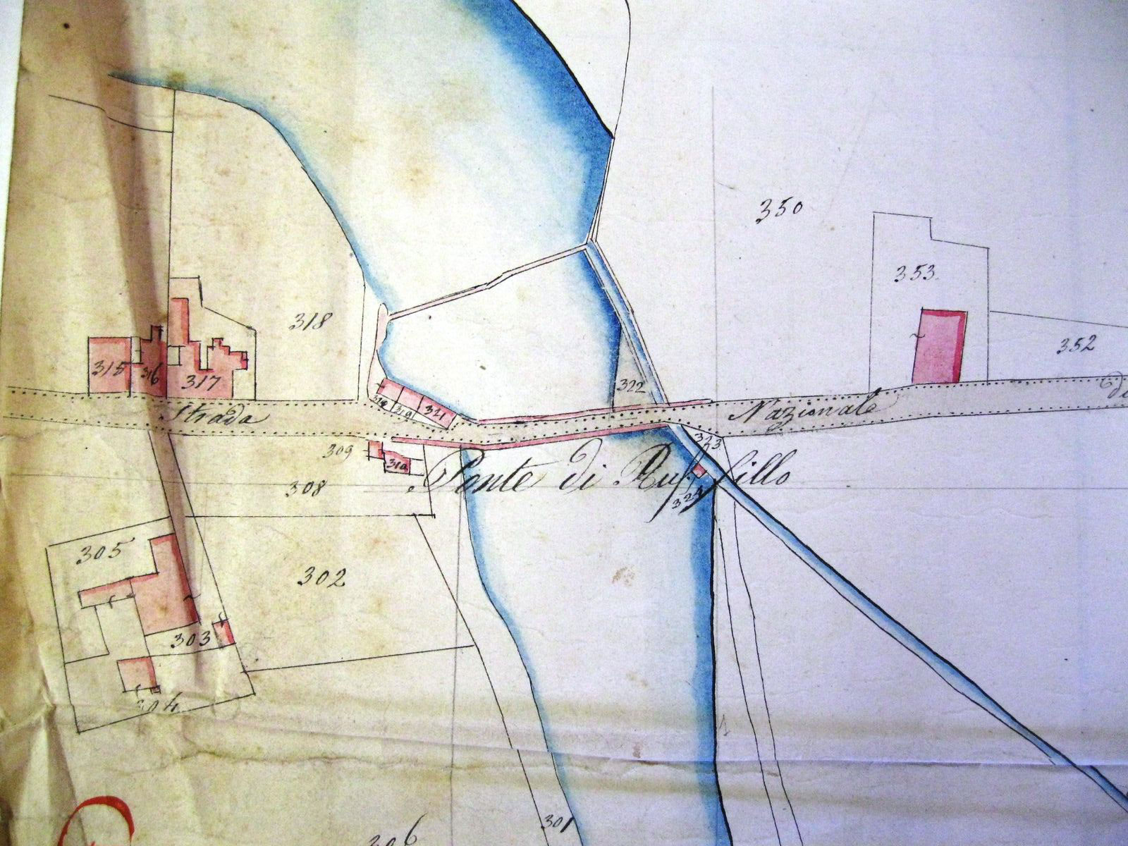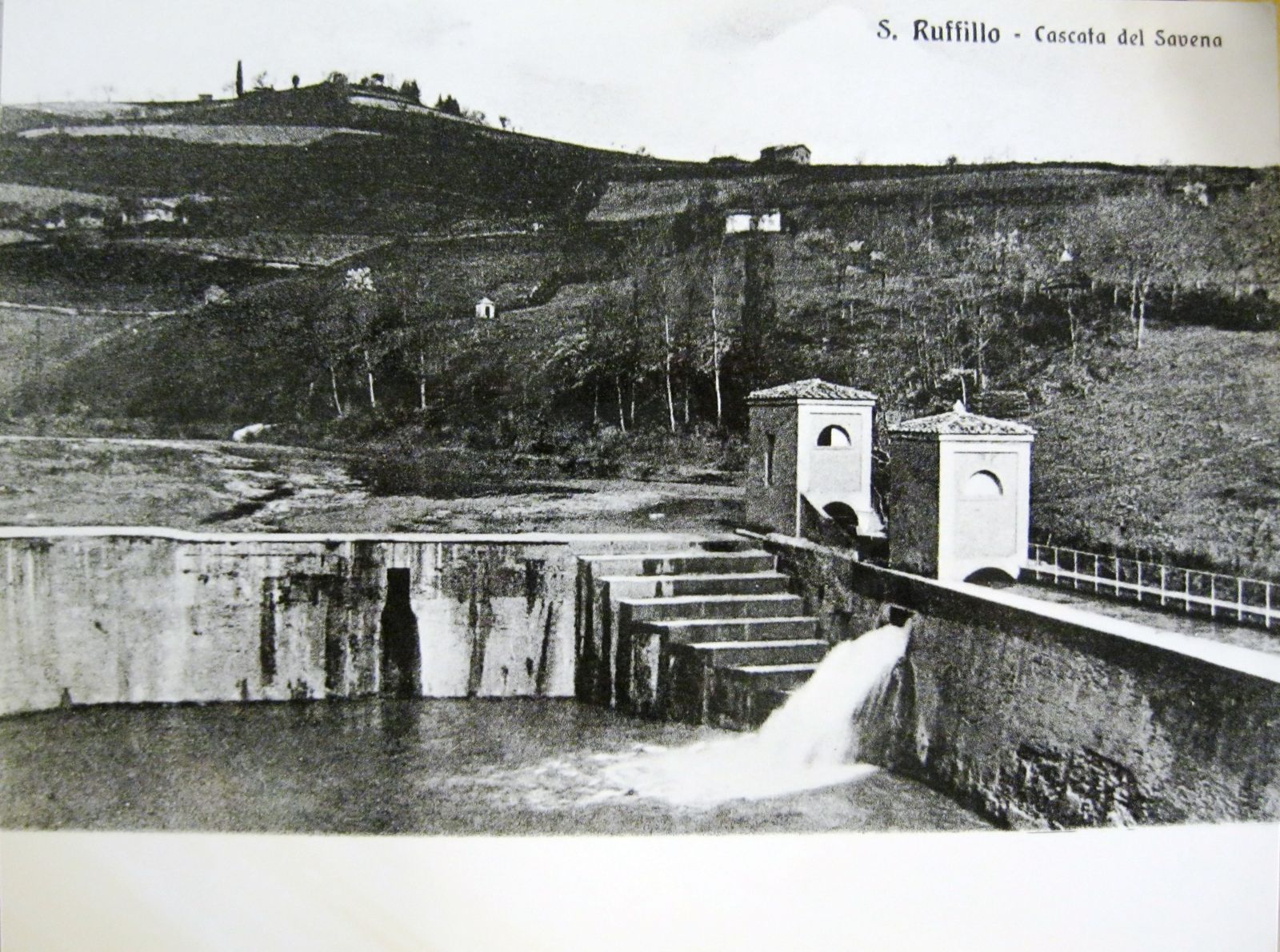 Risalgono al 1907 una serie di mappe catastali acquerellate dall’ingegnere d’ufficio Gaetano Stagni del Consorzio della Chiusa di S. Rufillo e del Canale di Savena intitolate “1907. Canale di Savena. Stato d’utenza. Riparto superiore alla città. Mappa del territorio sul quale si estende l’utenza”, che mostrano tutti i territori nei quali corre il canale: la prima mappa, relativa alla presa di San Rufillo mostra ancora la chiusa come un semplice muro continuo, senza gradinata ma con le due casette di guardia del canale. (fig. 7).