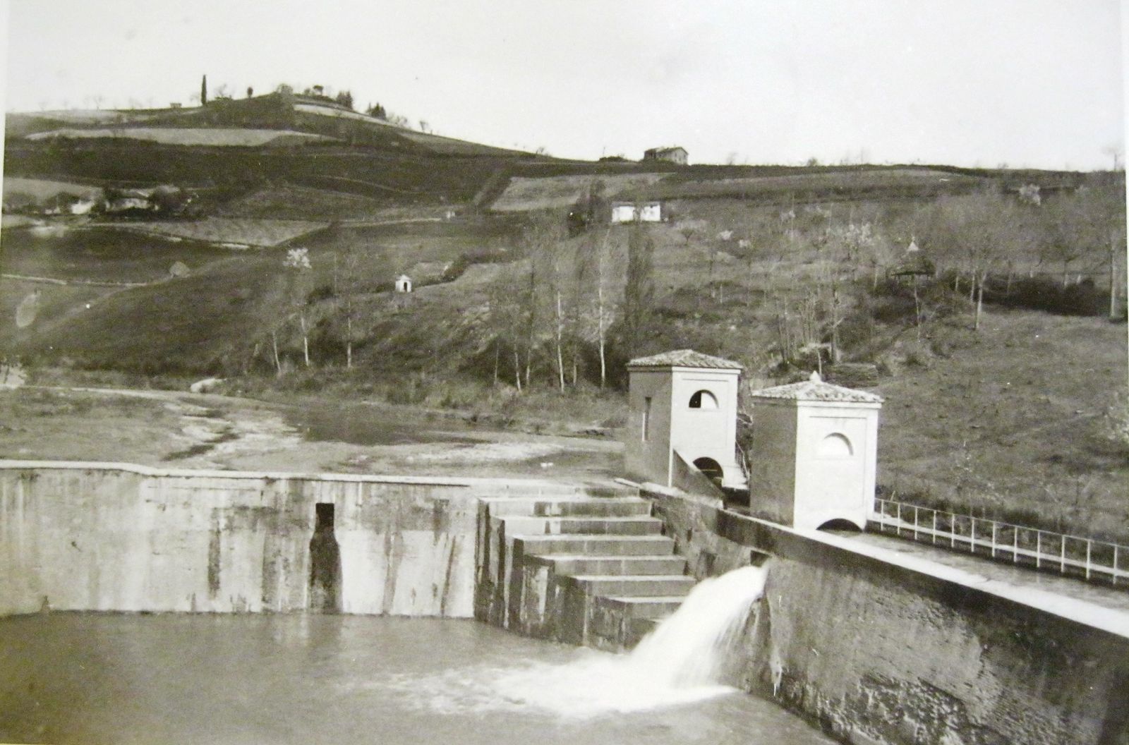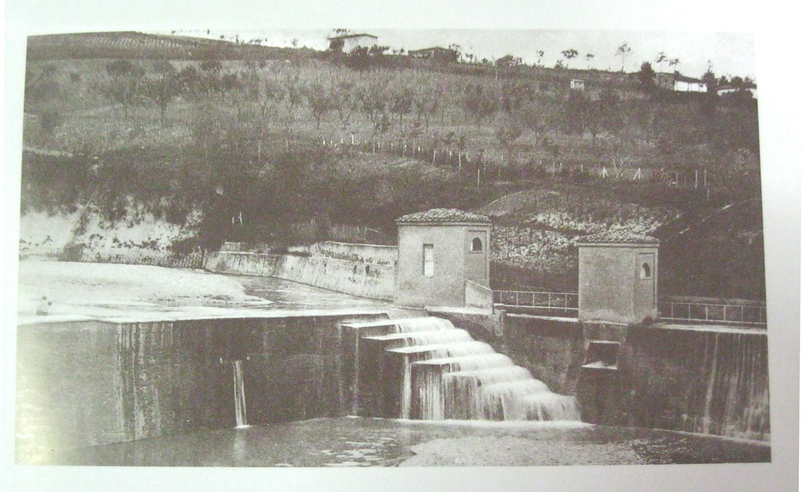 Dal 3 al 9 luglio fu tagliato il muro della vecchia diga per formare una scanalatura per fare l’immorsatura in calcestruzzo della sponda di levante della vecchia diga. Mancano i dati di luglio, mentre dal 31 luglio al 6 agosto furono rimosse le lastre vecchie di granito della diga; lo stesso si fece la settimana seguente e le lastre furono trasportate a Monte Albano, presso Sasso Marconi, come disposto dall’ing. Giuseppe Rinaldi del Genio Civile. Dal 14 al 20 agosto fu eseguita la scalpellatura del muro di mattoni e malta di cemento e fu tagliato un piccolo tratto di galestro (così è definita la roccia del fondo del torrente) per formare l’incastro per l’appoggio del cordolo di calcestruzzo in cemento armato nelle testate sud-est di sostegno delle nuove spalle in muratura della diga in costruzione. Dal 21 al 27 agosto un solo manovale trasportò con la carriola pietre per alzare il piano di campagna e formare la rampa di raccordo con la quota del muro di sponda dell’incile. Infine dall’11 al 17 settembre 1950 fu scalpellato il muro del vecchio piedritto per favorire l’aderenza del nuovo in calcestruzzo di cemento e furono tagliati gli incastri di immorsatura di collegamento con la vecchia diga nella zona della gradinata; altri operai rimossero blocchi di calcestruzzo e altri materiali di rifiuto per liberare il tratto in cui si doveva costruire la tubazione in cemento di diametro 40 cm per lo scarico delle acque nere e chiare dei fabbricati vicini alla diga. Oltre alla diga fu riparata la casa del custode e la casetta di manovra all’inizio dell’incile: è conservata la pratica fra gli atti del Provveditorato Opere Pubbliche, in corso di inventariazione presso l’Archivio Storico della Regione Emilia-Romagna. Alla pratica fu allegata la fotografia della casa del custode e di uno sfioratore, che si allega: in questa foto insolita si vede quindi la casa del custode, più a valle della diga, e un fabbricato sulla sponda del torrente dal lato di Rastignano, che di solito nelle fotografie non è ripreso.
