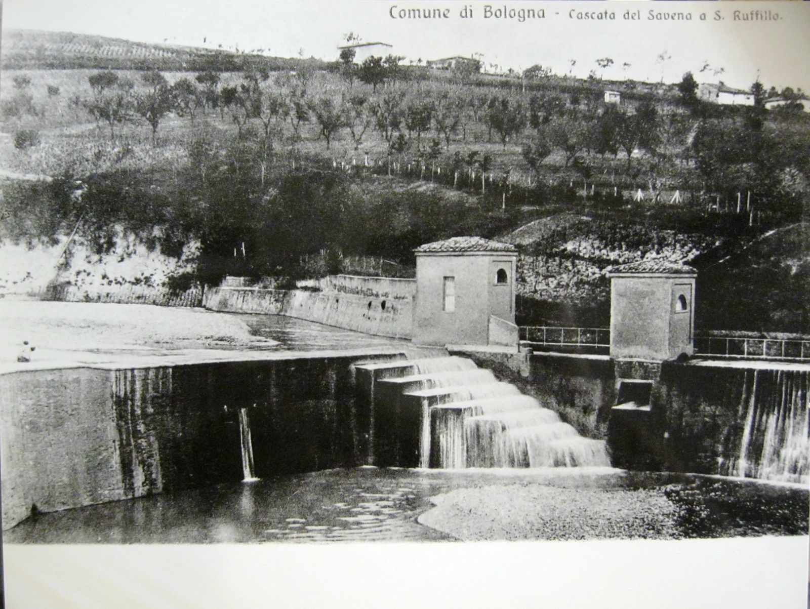 Invece la raccolta di cartoline e fotografie di Giovanni Mengoli conservata presso le Collezioni d’Arte e di Storia della Cassa di Risparmio in Bologna offre alcune vedute interessanti della chiusa e della chiusa con il nuovo ponte: il Mengoli lavorò come editore di cartoline, tratte da fotografie altrui, fra il 1900 e il 1915. Nel 1900 aveva sede in via Rizzoli 11/E, mentre nel 1913 si trasferì in via Ugo Bassi 10; nel 1915 cessò l’attività, ma morì a Bologna (dove era nato il 30 agosto 1860) solo il 15 gennaio 1926. Una sua immagine intitolata “Cascata del Savena a S. Ruffillo” (foto 3) mostra la chiusa costituita dal semplice muro e dai gradini, con le due casette di guardia del canale; una del tutto simile (foto 4) mostra la stessa ripresa ma con il torrente in secca, con l’acqua che esce dallo sfioratore del canale. Due immagini raffigurano in primo piano il nuovo ponte (foto 5 e 6) e in secondo piano, ma ben visibile, la chiusa, identica alle immagini precedenti. In un album giunto in un secondo momento presso le Collezioni è conservata la fotografia da cui è tratta la cartolina con il torrente in secca (foto 7).