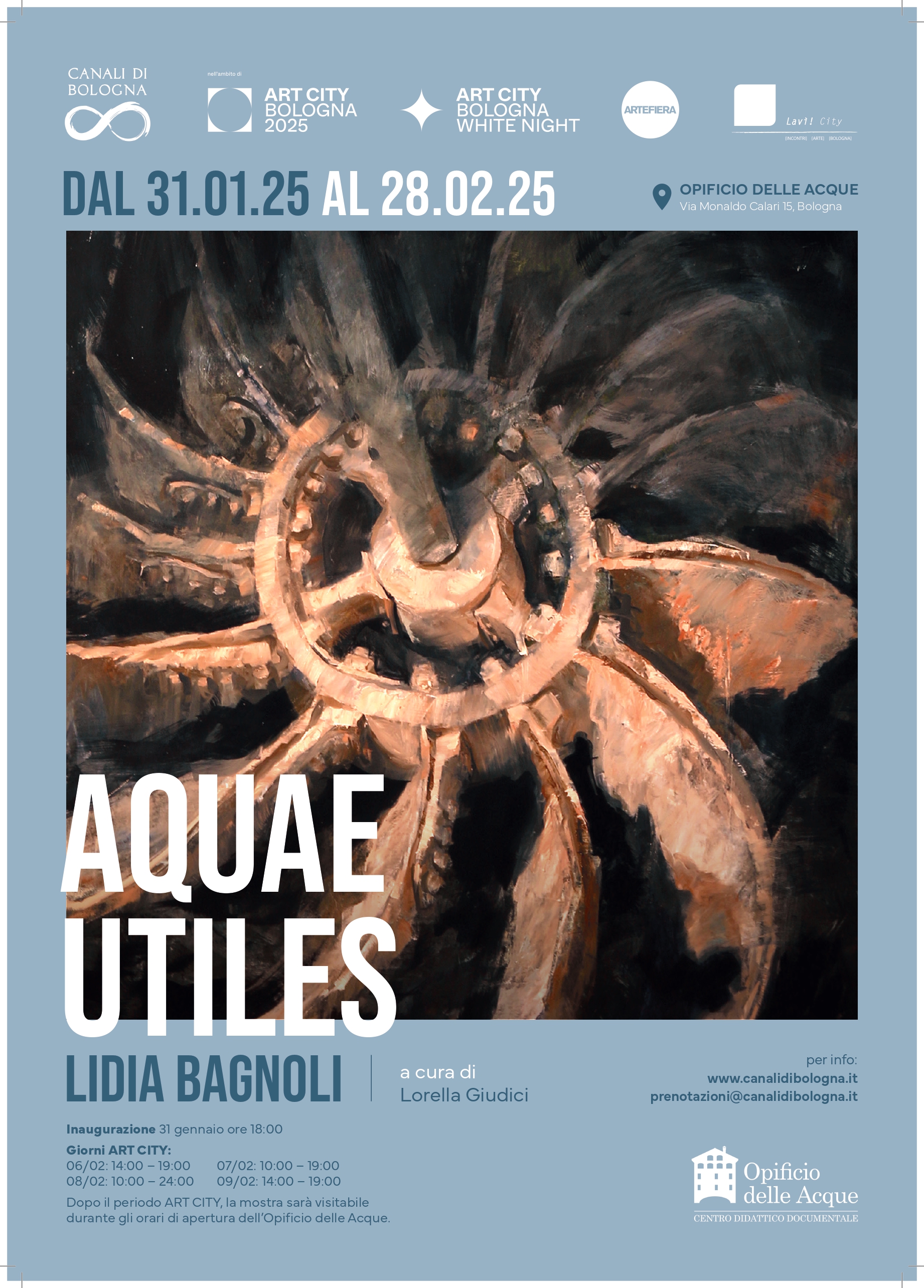 Il titolo di questa mostra Aquae Utiles, tratto da un verso del Cantico delle Creature in cui San Francesco cita per primo l’utilità dell’acqua "Sor acqua, la quale è multo utile, et humile, e casta...", coglie in tutta la sua forza, l’aspetto “gestionale” del raffinato lavoro quotidiano della mano dell’uomo, per una volta non distruttiva, ma curativa del territorio e dei suoi bisogni. Le opere di Lidia partono da questo concetto di utilità dell’acqua, non solo come risorsa naturale, ma anche come elemento centrale nella vita urbana e industriale, esplorando questa visione attraverso le acque che scorrono nei canali di Bologna e il loro rapporto con le macchine e i processi industriali. L’acqua diventa un motore invisibile che anima e modella lo spazio e l’ambiente umano. La sua pittura trasforma e amplifica la realtà, le attrezzature industriali si elevano a vere e proprie architetture, in cui la forza del paesaggio industriale si fonde con una dimensione più intima e personale.