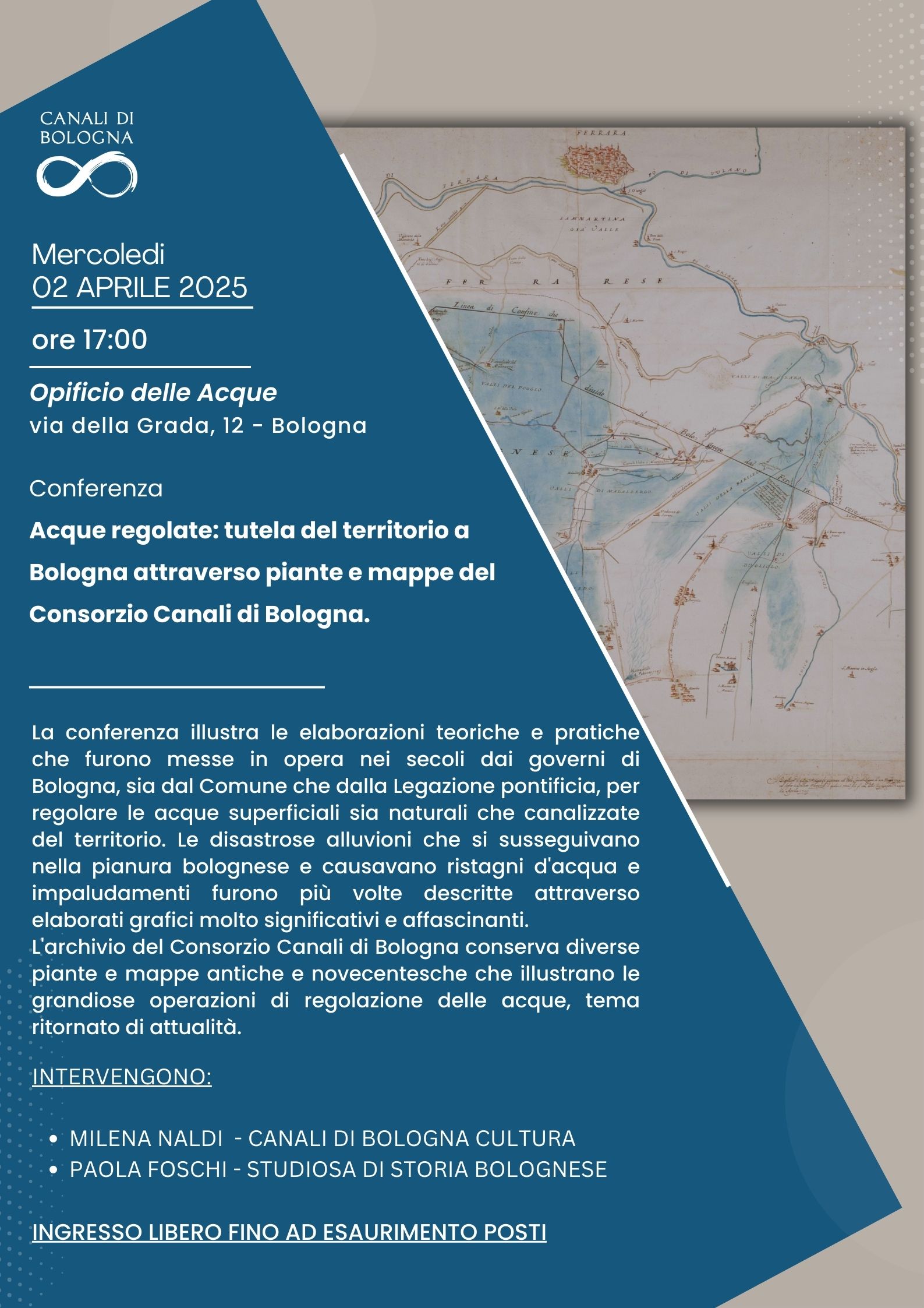 Il Consorzio Canali di Bologna è lieto di presentare la conferenza "Acque regolate: tutela del territorio a Bologna attraverso piante e mappe del Consorzio Canali di Bologna", un evento dedicato alla storia e all'importanza della gestione delle acque nella nostra città.
