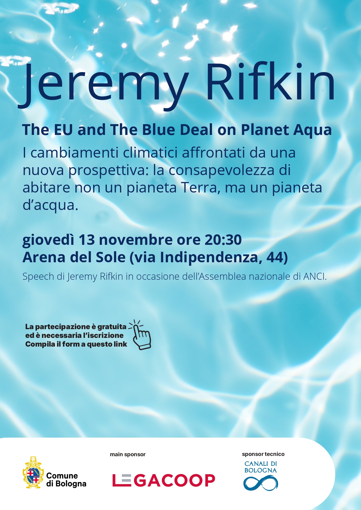 Rifkin proporrà uno speech dal titolo “The EU and The Blue Deal on Planet Aqua”, che affronta i temi dei cambiamenti climatici da una prospettiva inedita: la consapevolezza di abitare non un “pianeta Terra”, ma un pianeta d’acqua.